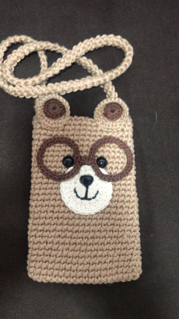 The bear’s head and ears are usually crocheted separately and then attached securely. These details give the Cell phone holder with a crocheted bear design. its distinctive and adorable appearance.