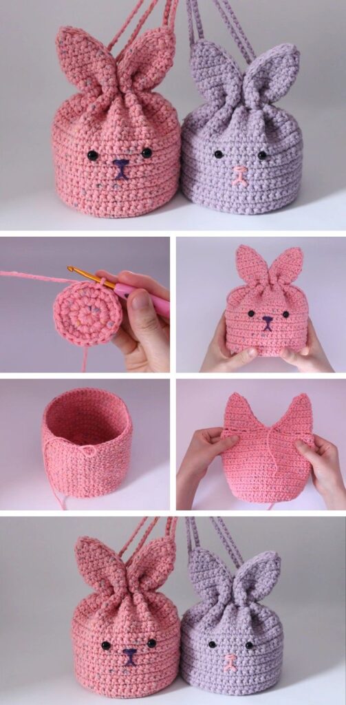Chain stitches may be used for drawstrings or decorative elements in the Crochet bunny pouch.
