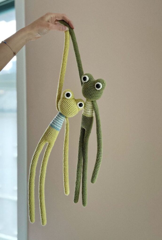 The frog shape is especially suitable for a crocheted amigurumi frog: a stretchy gymnastics toy for babies. because it naturally suggests movement and flexibility. Long limbs and a rounded body allow for gentle stretching and playful interaction.