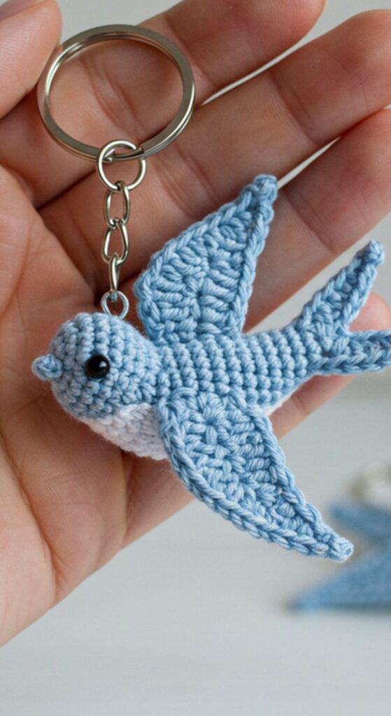 Now comes the fun part: adding the finishing touches to your crocheted bird keychain 🕊️. Use a small piece of black yarn or a bead to create the bird’s eyes. You can also add a little triangle of orange or yellow yarn for the beak, making the bird look even more realistic.