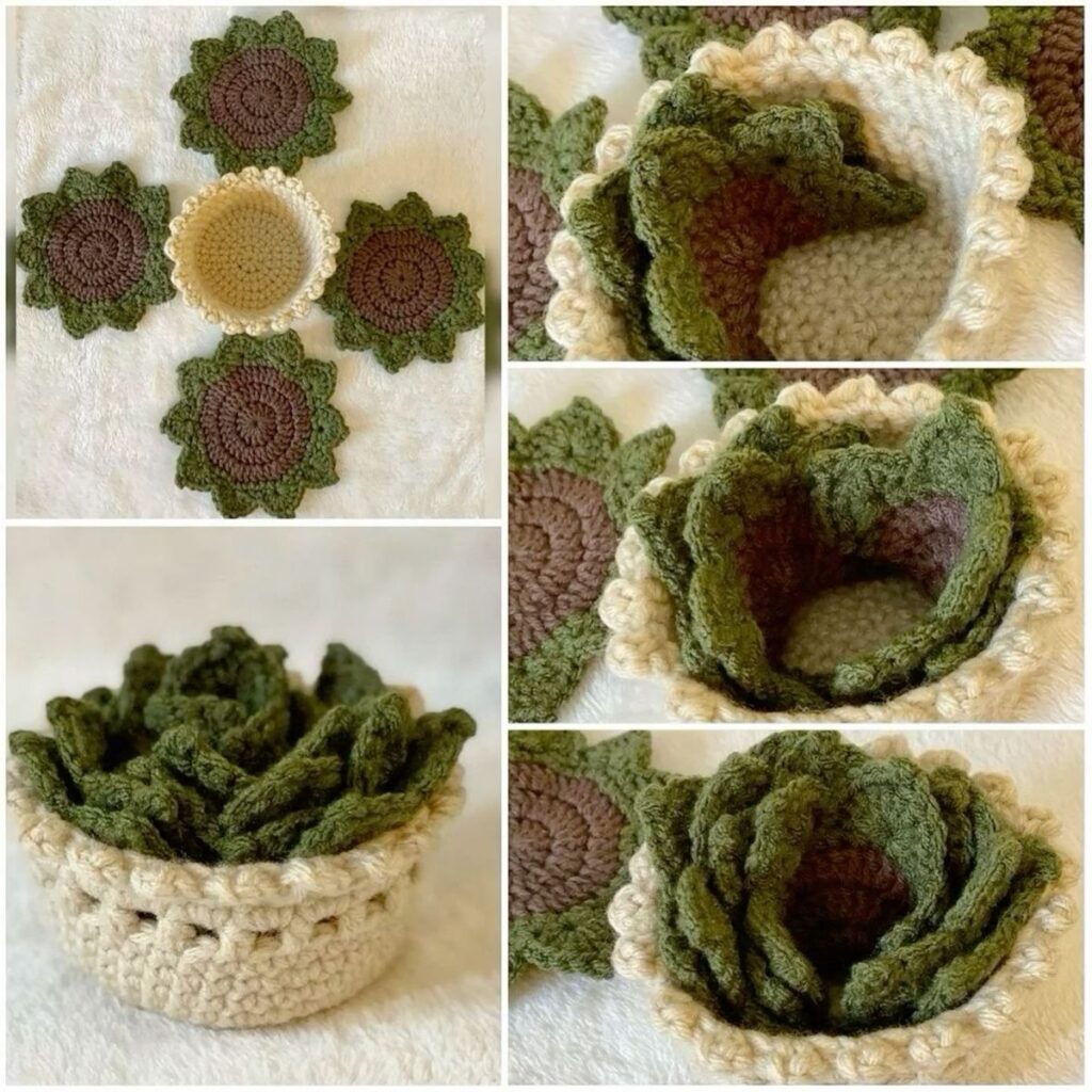 Some crafters like to create sets of Crocheted coasters with succulents, with each coaster representing a different type of succulent plant. This approach makes the collection look like a miniature crochet garden when placed together on a table.