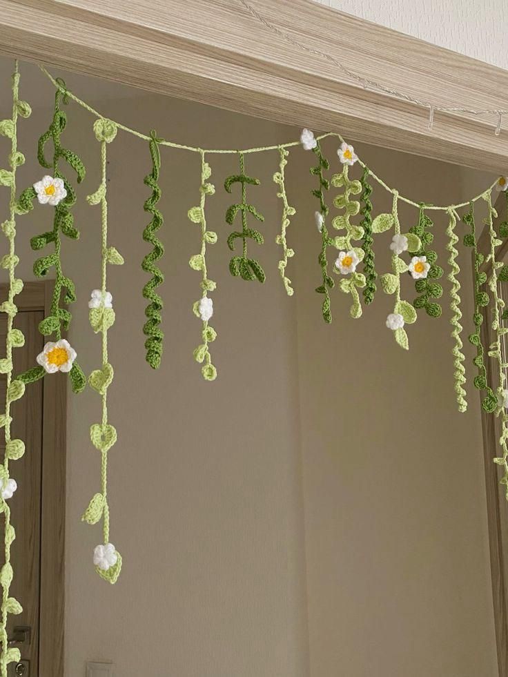 A crocheted flower garland can decorate walls, windows, shelves, party tables, nurseries, or seasonal displays.