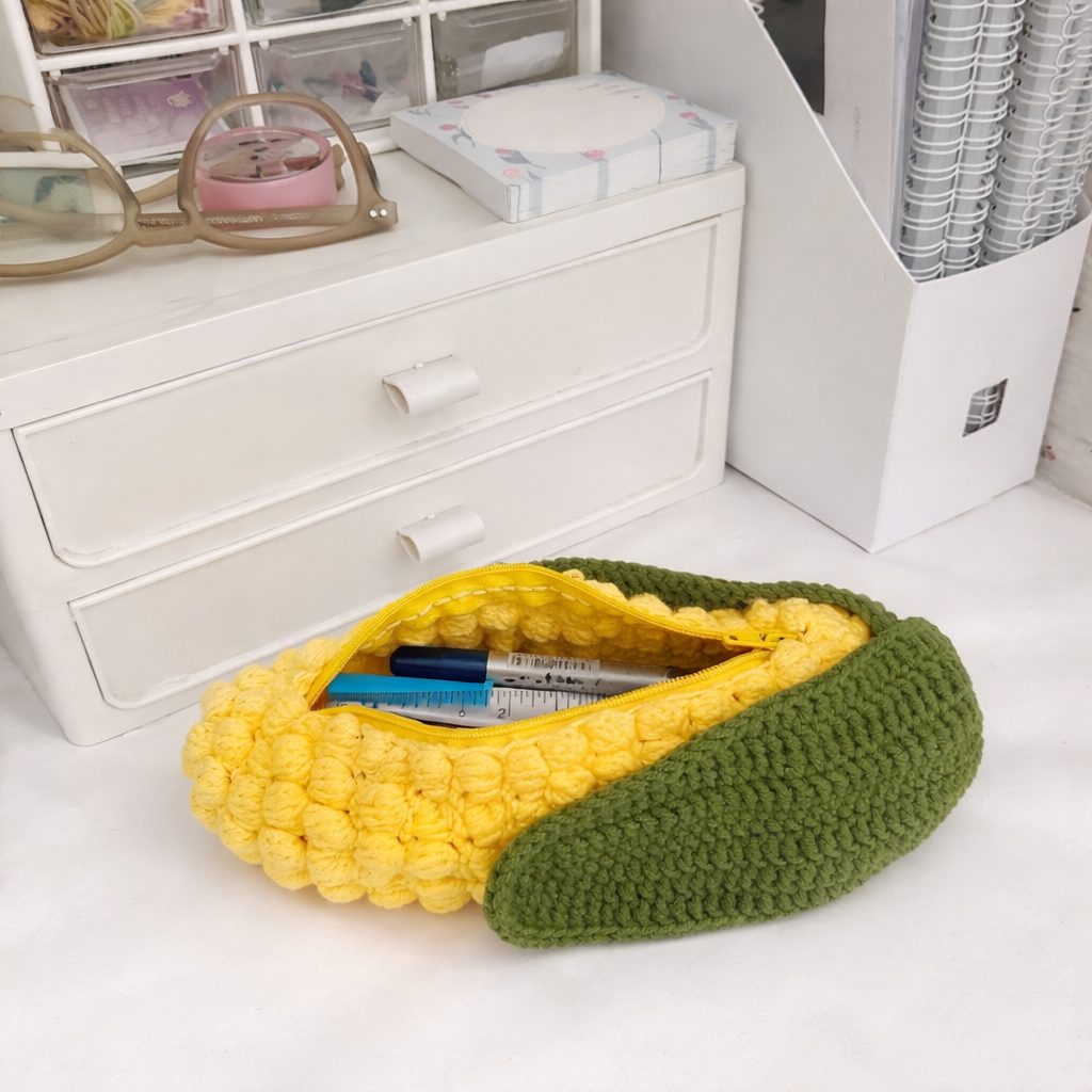 Finally, this pencil case appeals to craft enthusiasts and collectors. Many people enjoy owning novelty crochet items, and the fun crocheted corn-shaped pencil case fits perfectly into collections of whimsical handmade accessories.