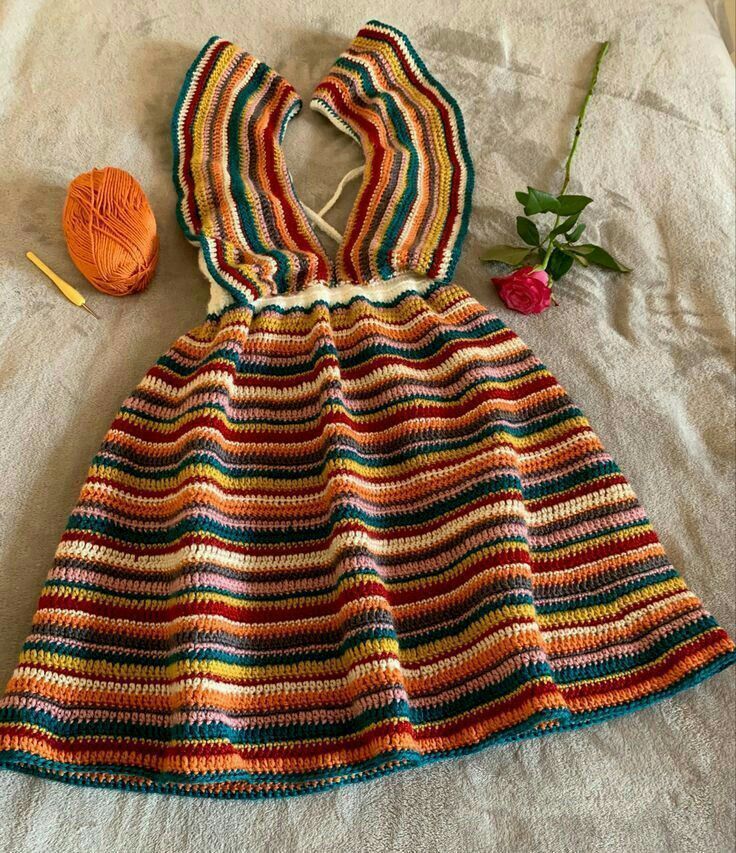 One of the reasons people say I’m in love with this rainbow crochet dress. is the wide range of design possibilities. Rainbow crochet dresses can be short, midi, or long, depending on personal style and intended use.