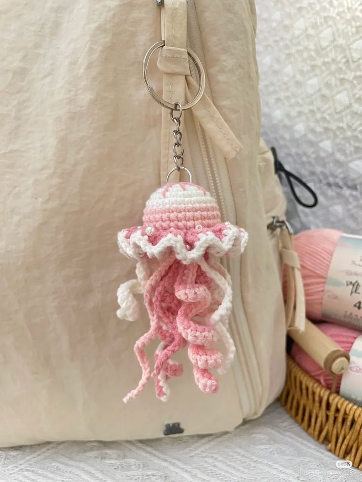 A Pink jellyfish-shaped crochet keychain: kawaii plush keychain with an ocean theme. is not only decorative but also practical. It can be attached to keys, bags, pencil cases, or backpacks, adding a personal and cheerful touch.
