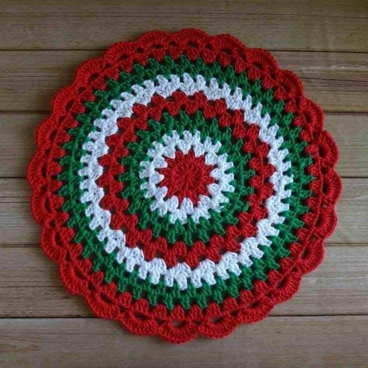 As the piece grows, you can begin adding decorative patterns such as shells, fans, or picots around the edges. These details give the sousplat a festive and elegant appearance. For a classic Christmas feel, consider alternating rows of red and green or using golden yarn for the border. Small design changes can make each sousplat unique, so feel free to experiment with creativity.