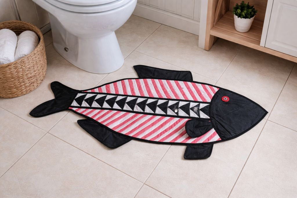A rug created from the Tutorial for a fish rug made with leftover fabric can be placed in kitchens, bathrooms, children’s rooms, or craft spaces.